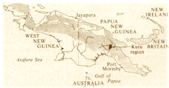 A finales del siglo XIX, el pueblo Fore de las Tierras Altas Orientales de Papúa-Nueva Guinea cambió sus costumbres funerarias. Los familiares fallecidos empezaron a ser cocinados y comidos, las mujeres y los niños recibían el cerebro de sus difuntos cuando se repartían las piezas. Es decir, se comían los sesos de sus seres queridos. El endocanibalismo ritualista -comer parientes como parte de un ritual de duelo en contraposición a comerse enemigos, es decir, el exocanibalismo– se practicaba no solo en el área donde empezó a darse el kuru, sino en muchos grupos circundantes de las Tierras Altas Orientales de Papúa en los que esta enfermedad nunca se desarrolló.