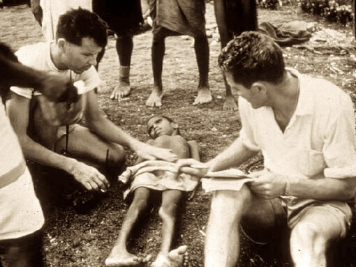 Gajdusek (izquierda) y Zigas (derecha) con un niño afectado por kuru.