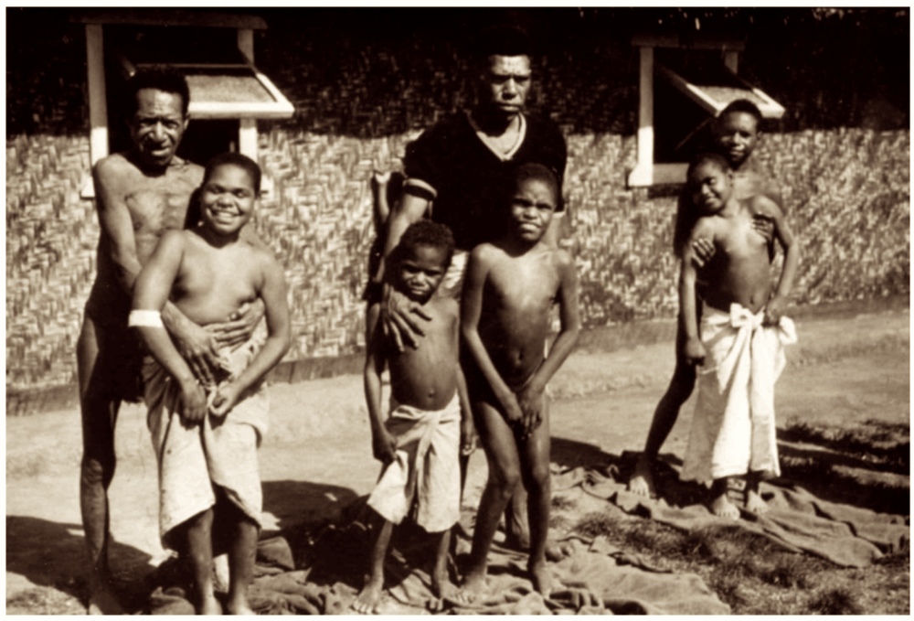 Niños de los Fore con kuru. Uno de los signos de la enfermedad era la risa sardónica. C. 1970. gente Fore.
